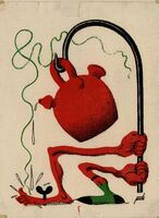 VISIONES DE NEURASTENIA. Un botijo rojo se encuentra sujeto por un gancho ligeramente inclinado deja caer algunas gotas del líquido que lleva en su interior. Dos brazos rojos, surgidos de unos Pies, uno de ellos parece que esta clavado al suelo con una palomilla, el otro con un calcetín verde, sujetan el gancho oscuro. Líneas ondulantes de color verde se sitúan alrededor de las figuras. El dibujo está firmado.Prueba de imprenta. Ilustración realizada para la revista semanal novelas y Cuentos. Titulo: Visiones de neurastenia. Autor: W. Fernández Flórez. Nº publicado: 987. Fecha: 18-06-1950. Tomo NC.: 49/ 50/. Nº de ficha duplicada 2353.