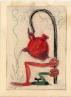 VISIONES DE NEURASTENIA. Dos figuras extrañas con forma de brazos rojo y verde con su mano roja, cada uno, surgen de la superficie del suelo agarrando un palo negro del que cuelga un botijo inclinado dejando verter su líquido sobre el suelo. De este líquido se desprende un hilito verde ondulante de humo. El dibujo está enmarcado.Boceto realizado para la ilustración de la revista semanal No velas y Cuentos. Titulo: Visiones de neurastenia. Autor: W. Fernández Flórez. Nº publicado: 987. Fecha: 09-04-1950. Tomo NC.: 49