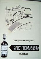 Veterano Osborne 2 Imagen de un hombre caricaturizado en la cama rodeando con su brazo a una gran copa, debajo se puede leer “la mejor compañía Veterano Osborne”.