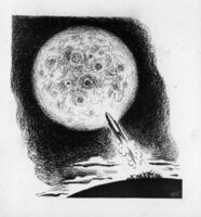 Viaje espacial Escena en blanco y negro, de una gran luna hacia donde se dirige un cohete espacial, símbolo de una era, de la investigación y desarrollo para el conocimiento espacial, y el deseo del hombre de llegar y conquistar la luna y mucho más.