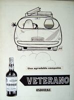 Veterano Osborne Dibujo con la silueta de un coche con maletas encima de la baca y el piloto de espaldas saludando con su mano y al lado como copiloto una copa, debajo un cartel cuya dirección apunta a una botella de veterano Osborne.