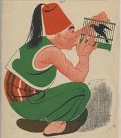 VIDA DEL ESCUDERO MARCOS DE OBREGON En el centro de este dibujo destaca la imagen de un turco con el sombrero muy alto de color rojo y un traje verde con el fajín rojo y blanco contemplando, en una posición agachada, una jaula con un pájaro en su interior de color negro. La figura del hombre se encuentra de perfil.Prueba DE imprenta. Ilustración realizada para la revista semanal Novelas y Cuentos. Titulo: Vida del escudero Marcos de Obregon. Autor: Vicente Espinel. Nº publicado: 819. Fecha: 10-01-1947. Tomo NC.: 17.