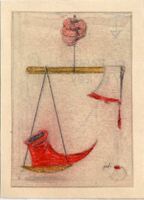 EL ZAPATERO DEL REY. Una original balanza, cogida por una mano humana, con un platillo en el que hay un zapato rojo y en la sujeción un hacha teñida de sangre es el tema de esta composición enmarcada que está firmada por el artista que la ha imaginado.Boceto realizado para la ilustración de la revista semanal Novelas y Cuentos. Titulo: El zapatero del Rey. Autor: José Zorrilla. Nº publicado: 1062. Fecha: 16-09-1951. Tomo NC. 51
