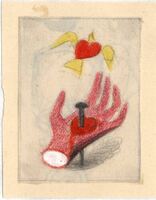 EN VANO. Sobre la palma de una mano rosa abierta hay un corazón rojo. Ambos están atravesados por un clavo. Por encima de la mano emprende el vuelo una paloma amarilla con un corazón rojo. El dibujo está enmarcado con líneas suaves.Boceto realizado para la ilustración de la revista semanal Novelas y cuentos. Titulo: En vano. Autor: Enrique Sienkiewicz. Nº publi8cado: 1103. Fecha: 29-06-1952. Tomo NC.: 42.