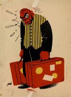 ES PELIGROSO ASOMARSE AL EXTERIOR. En el dibujo firmado destaca la imagen de un mayordomo con pantalón negro y chaleco amarillo con rayas negras llevando en cada mano una maleta roja, viéndose en una de ellas pegatinas blancas y amarillas. En su cara se nota un gesto de enfado.Prueba de Imprenta. Ilustración realizada para la revista semanal Novelas y cuentos. Titulo: Es peligroso asomarse al exterior. Autor: E. Javier Poncela. Nº publicado: 1058. Fecha: 19-08-1951. Tomo NC. 45.