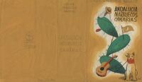Guías Afrodisio Aguado Sobre un fondo de colores tierra, en el lado derecho la imagen de un captus verde con la figura de un hombre con sombrero mejicano y una guitarra, en la parte inferior aparece la figura de un perro con un objeto rojo en su boca, en el resto del cartel anotaciones a lápiz donde se lee, Andalucía, Marruecos y Canarias.