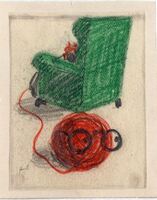 LA CASA FATAL. Reposando en una butaca verde con orejas una anciana se dedica a sus labores de costura mientras su ovillo de lana roja se pasea con unas gafas negras puestas. En este dibujo enmarcado el pintor ha colocado su firma atestiguando su presencia.Boceto realizado para la ilustración de la revista semanal Novelas y Cuentos. Titulo: La casa fatal. Autor: P.Wentworth. Nº publicado: 1222. Fecha: 10-10-1954. Tomo NC.: 36.