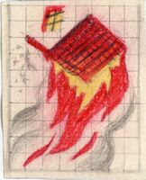 La casa en llamas Una casa en llamas es el tema central de este dibujo enmarcado y cuadriculado. Destacan los colores amarillos, rojos y unas manchas grisáceas como la humareda que se desprende del incendio.Boceto realizado para la ilustración de la revista semanal Novelas y Cuentos. Titulo: Autor: Nº publicado: Fecha: Tomo NC.: