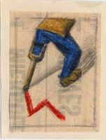 LA MARCA DE LOS CUATRO. Un hombre del que se ven nada más que sus piernas, una normal y otra de palo, lleva un pantalón azul y una camisa amarilla al igual que su zapato. La pierna de palo ha dibujado en la superficie del suelo una especie de “4” de color rojo. El dibujo está enmarcado mediante líneas muy suaves.Boceto realizado para la ilustración de la revista semanal Novelas y Cuentos. Titulo: La marca de los cuatro. Autor: A. Conan Doyle. Nº publicado: 1183. Fecha: 10-01-1954. Tomo NC. 38