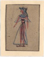 La mujer egipcia con vestido transparente Destaca una mujer egipcia con el cuerpo de frente y la cabeza, adornada con un tocado típicamente egipcio, de perfil. Una túnica azul clara y transparente cubre el cuerpo de la mujer. El dibujo está enmarcado.Boceto realizado para la ilustración de la revista semanal Novelas y Cuentos. Titulo: Autor: Nº publicado: Fecha: Tomo NC.