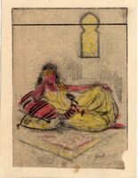 La muchacha del harén En el escenario de las mil y una noches, sobre unos almohadones amarillos y a rayas negras y rojas, descansa una muchacha del harén de un sultán árabe. Sus cabellos sueltos son negros como la noche y su traje es amarillo. Destaca en la composición un ventanal de características árabes cuyo fondo es amarillo. En la parte superior del dibujo enmarcado destaca una línea oscura en posición horizontal. Se puede apreciar, también, la firma del pintor.Boceto realizado para la ilustración de la revista semanal Novelas y Cuentos. Titulo: Autor: Nº publicado: Fecha: Tomo NC.