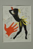 La novela de un Spahi. Imagen en la que se aprecia una figura femenina de color negro en posición de baile llevando una falda de flecos en tono amarillo. A la izquierda de la imagen, en la parte inferior, una mano roja y en la parte superior, a la derecha, un dibujo semejante al sol en color amarillo.Boceto realizado para la ilustración de la revista Novelas y Cuentos: Titulo: La novela de un Spahi. Autor:Pierre Lotti Nº publicado:1238, Fecha: 30-01-55 Tomo NC// 4 Prueba de Imprenta/ 428