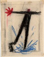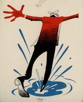 LA PIEDRA ANGULAR. En este dibujo enmarcado por medio de líneas abocetadas a lápiz un hombre de espalda en traje negro y muy alto pisa un charco de agua azul salpicándose. La mano derecha tremendamente desproporcionada pintada en rojo.Boceto realizado para la ilustración de la revista semanal Novelas y Cuentos. Titulo: La piedra angular. Autor: Emilia Pardo Bazan. Nº publicado: 1151. Fecha: 31-05-1953. Tomo NC.: 34.