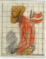 La operación En el dibujo cuadriculado y enmarcado se representa la figura de un chico joven con camisa naranja, pantalón amarillo y con sombrero también amarillo agachando ligeramente la espalda sobre la que unas manos realizan una operación. Una mancha negra deja adivinar la sombra que refleja la figura.Boceto realizado para la ilustración de la revista semanal Novelas y Cuentos. Titulo: Autor: Nº publicado: Fecha: Tomo NC.: