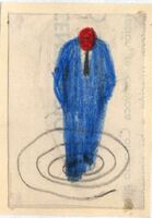 LA NOVELA DE VALLE ALEGRE Sobre círculos concéntricos se halla la figura de una persona en pie cuyo género es indefinible. Viste una larga túnica azul y en su cabeza cabizbaja lleva un sombrero rojo. Sus manos están encubiertas. El dibujo está enmarcado.Boceto realizado para la ilustración realizada para la revista semanal Novelas y cuentos. Titulo: La novela de valle alegre. Autor: N. Hawthorne. Nº publicado: 1112. Fecha: 31-08-1952. Tomo NC. 57