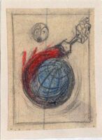 LA PESTE ESCARLATA Y EL IDOLO ROJO. Formas extrañas configuran este dibujo que se halla enmarcado: la luna parece que se asombra y la tierra, que la están pintado de rojo. La cara espantada de la luna nos hace pensar que la pintura roja se trata de sangre.Boceto realizado para la ilustración de la revista semanal Novelas y Cuentos. Titulo: La peste escarlata y el Idolo rojo. Autor: Jack London. Nº publicado: 1186. Fecha: 31-05-1954. Tomo NC. 46.