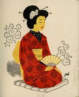 La mujer oriental Sentada sobre sus piernas destaca en la imagen una mujer oriental con la cara y las manos muy amarillas y el pelo negro recogido en un sofisticado peinado. Su traje es rojo con flores negras y en la cintura lleva un lazo amarillo. En su mano sostiene un abanico blanco y amarillo. Alrededor de la figura destacan algunas flores de color negro. Es un dibujo en el que el pintor ha querido dejar su huella con su firma.Prueba de imprenta. Ilustración realizada para la revista semanal Novelas y Cuentos. Titulo: Autor: Nº publicado: Fecha: Tomo NC.