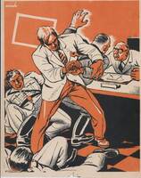 La pelea Una gran pelea se sucede en esta habitación de paredes rojas y en la que algunos hombres de bata blanca toman parte. Algunos están de pie otros están tumbados por el suelo. El dibujo está firmado como puede verse en la parte superior.Prueba de imprenta. Ilustración realizada para la revista semanal Novelas y Cuentos. Titulo: Autor: Nº publicado: Fecha: Tomo NC.: