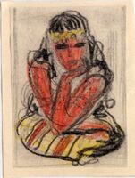 La mujer pensativa El tema que el artista ha tomado para este dibujo ligeramente enmarcado es la figura de una mujer joven de cultura árabe que apoya su cara en la mano en actitud pensativa, y su vez, su cuerpo se apoya en un almohadón amarillo y negro. Sus cabellos son negros y los lleva sueltos con una diadema en la frente, su piel es oscura.Boceto realizado para la ilustración de la revista semanal Novelas y Cuentos. Titulo: Autor: Nº publicado: Fecha: Tomo NC.