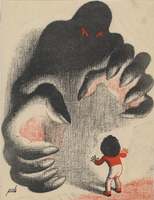 LA NOVELA DE UN NIÑO Un niño de espalda mira a una gran masa negra que ocupa todo el fondo del dibujo. Dicha masa negra, que intenta atrapar al niño, toma forma de figura humana con manos muy musculosas y una cara asustadora con los ojos rojizos. El dibujo está enmarcado.Bloceto realizado para la ilustración de la revista semanal Novelas y Cuentos. Titulo: La novela de un niño. Autor: Pierre Lotti. Nª publicado: 806y. Fecha: 20-10-1946. Tomo NC. 7. PI/ 4