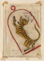 LA NIÑA DE LUZMELA Un gato de espalda a rayas negras y amarillas salta sobre un pájaro blanco que asustado emprende el vuelo dejando su posadera roja, sobre la que está el gato en ese momento. El dibujo está enmarcado.Boceto realizado para la ilustración de la revista semanal Novelas y Cuentos. Titulo: La niña de Luzmela. Autor: Concha Espina. Nº publicado: 1176. Fecha: 22-11-1953. Tomo NC. 53.