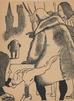 LOS DOS AMIGOS. Una pareja con largos abrigos de invierno, el hombre con uno en color amarillento y la mujer con otro de color rojo, pasea acompañada por la imagen de un ángel con la silueta amarilla que se encuentra al lado de la mujer. El dibujo está firmado.Prueba de imprenta. Ilustración realizada para la revista semanal Novelas y Cuentos. Titulo: Los dos amigos. Autor; I. Turgueniev. Nº publicado: 22-07-1956. Fecha: 22- 07-1956.
