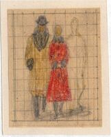 LOS DOS AMIGOS. Dos figuras, un hombre con abrigo largo amarillo y una mujer con abrigo largo y rojo son el centro de esta composición que se halla enmarcada y sobre una cuadricula. Una tercera figura de aspecto transparente con una silueta amarillenta y grisácea camina detrás de ellos.Boceto realizado para la ilustración de la revista semanal Novelas y Cuentos. Titulo: Los dos amigos. Autor: I. Turquemier. Nº publicado: 1315. Fecha: 22-07-1956. Tomo NC. 26