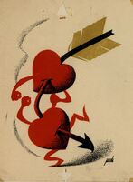 LOS ENAMORADOS Y UN CURIOSO ACCIDENTE. Destacan dos corazones realizando movimientos con brazos y piernas a los que se ha unido por medio de una flecha roja y amarilla. El dibujo está firmado por el pintor.Prueba de imprenta. Ilustración realizada para la revista semanal Novelas y Cuentos. Titulo: Los enamorados. Autor: C. Goldoni. Nº publicado: 1082. Fecha: 03-02-1952. Tomo NC.: 56. Nº DUPLICADO DE FICHA FINAL 2354.