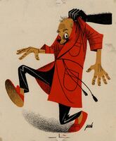 LOS BUSCADORES DE TESOROS. Un hombre con el pijama negro y una bata roja es cogido en su espalda al que le agarra la bata una mano que surge del lado izquierdo del dibujo firmado. La mano es de color negro.Prueba de imprenta. Ilustración realizada para la revista semanal Novelas y Cuentos. Titulo: Los buscadores de tesoros. Autor: W. Irving. Nº publicado: 1329. Fecha: 28-10 -1956. Tomo NC. 32.