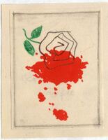 LOS COMPAÑEROS DE ULISES. Sobre un fondo claro apreciamos una gran mancha de rojo con salpicados como si fuera de sangre y una rosa con su corona de pétalos formados por líneas concéntricas y onduladas de color negro y con el tallo y las hojas verdes. De nuevo, se encuentra el dibujo enmarcado.Boceto realizado para la ilustración de la revista semanal Novelas y Cuentos. Titulo: Los compañeros de Ulises. Autor: Pierre Benoit. Nº publicado: 1201. Fecha: 16-05-1954. Tomo NC.: 47