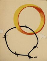 MAS FUERTE QUE EL AMOR. Sobre un fondo claro se vislumbran, en este dibujo firmado, dos objetos circulares: un anillo dorado y un alambre negro con picos, entrelazados.Prueba de imprenta. Ilustración realizada para la revista semanal Novelas y Cuentos. Titulo: Mas fuerte que el amor. Autor: Jacinto Benavente. Nº publicado: 1095. Fecha: 04-05-1952. Tomo NC.: 45