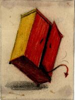 MISS ROVEL La figura que se representa en el dibujo es un armario de color rojo y amarillo en su lateral. El objeto se apoya sobre uno de sus pies y de su puerta entreabierta se despliega el rabo de un diablillo en color rojo. La sombra de la base del armario es de color negra y en toda la imagen se aprecia un gran movimiento.Boceto realizado para la ilustración revista Novelas y Cuentos. Titulo: Miss Rovel. Autor: Víctor Cherbuliez. Nº publc. 1225 Fe cha: 31-10-1954 Tomo NC 41. Prueba Imprenta: 94