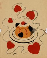 MONINA Dibujo de un postre en amarillo, rodeado y decorado por corazones negro y rojos.Boceto realizado para la ilustración de la revista semanal Novelas y Cuentos. Titulo: Monina. Autor: Gy P. Nº publicado: 1074. Fecha: 09-12-1951. Tomo NC.: 47