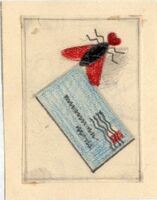 MOSQUITA EN PALACIO. Una mosca de cuerpo negro, con sus alas y cabeza rojas, y un sobre azul son los motivos que componen esta escena enmarcada. Ambas figuras se hallan encima una de la otra.Boceto realizado para la ilustración de la revista semanal Novelas y Cuentos. Titulo: Mosquita en Palacio. Autor: Adolfo Torrado. Nº publicado: 1121. Fecha: 02-11-1952. Tomo NC. 43