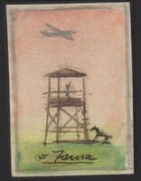 La torre de vigía En este dibujo que tiene una inscripción en color negro y de difícil lectura en la parte inferior se ha representado un paisaje de verdes prados sobre los que se ha levantado una torre de vigía en cuyo interior hay un hombre. Un caballo negro está atado a un poste y sobre un cielo rosado vuela un avión. El dibujo está enmarcado vislumbrándose un fondo negro.