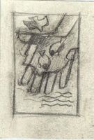 Las campanas En la parte superior de este dibujo en el que destaca el color naranja fuerte destacan dos campanas doradas alrededor de las cuales vuelan tres pájaros blancos. Las campanas se envuelven en un áurea amarilla. Sobre ellas hay una frase en color rojo y en letra caligráfica de difícil interpretación.