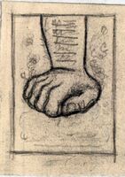 Mano apoyada y cerrada En este dibujo enmarcado se ve un brazo, sobre el que destacan pequeñas líneas negras horizontales, y una mano cerrada que se apoya sobre algo que no se aprecia en la composición.
