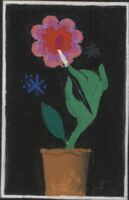 La flor pintada por un tallo En el dibujo enmarcado y sobre un fondo negro destaca una maceta marrón en la que crece un tallo verde en forma de mano que con un pincel negro y blanco dibuja una flor en tonos rosa, rojo y morado. A su lado brilla una estrella azul.