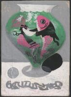 La decoración de la jarra Sobre un fondo claro se ha representado en el centro de este dibujo una jarra decorada con una curiosa escena en la que un pez rosa y vestido con un traje oscuro baila con una muchacha vestida con una falda rosa, pañuelo igualmente rosa y camisa blanca. El fondo de la escena es verde. En la parte inferior hay algunas letras abocetadas, de ahí su imposible lectura.
