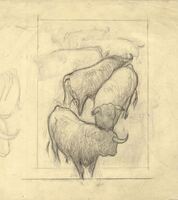 Manada de reses bravas En primer término tres toros en diferentes posturas, y en un segundo plano a modo de bocetos de suaves trazos, se observan otros toros que forman el conjunto, todo ello enmarcado. Hermosísimo dibujo, que sirve para comprender –si observamos las diferentes intensidades de acabados- de la técnica de dibujo de nuestro artista.