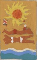 Mar. Mujer. Guitarra. Caballo En este dibujo enmarcado se representa el agua azul del mar con líneas ondulantes blancas. Sobre el agua, el cuerpo en posición horizontal de una mujer de la que solamente se ve su barriga, las piernas y la parte inferior del biquini blanco. Por detrás, se encuentran una guitarra, también en posición horizontal, y un caballo marrón de perfil. En el fondo se vislumbra un paisaje de montaña con la torre de un castillo gris. En el cielo azul brilla intensamente el sol.