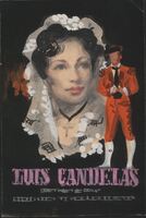 Luis Candelas Sobre un fondo negro vislumbrándose, a la derecha, las cúpulas de edificios religiosos de una ciudad se ha representado la imagen facial de una mujer muy bella de pelo negro que lleva su cabeza cubierta con una mantilla blanca. Del cuello le cuelga una cruz. Superpuesta a esta imagen se ve la figura de un hombre, en cuerpo entero, al estilo torero con un traje rojo y medias blancas. En la parte inferior se lee el título de la obra: “Luis Candelas” en color morado.