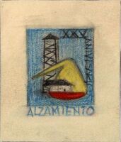 XXV Aniversario. Alzamiento En el centro de la composición enmarcada en un cuadrado pequeño destaca un hombre azul, de espalda que intenta arrastrar con esfuerzo una gran rueda amarilla. El lema de la escena en color amarillo se coloca en la parte inferior.