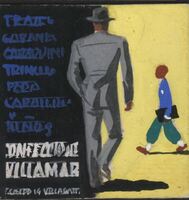 Villamar Este dibujo se encuentra dividido en dos partes: en la izquierda predomina el color negro sobre el que se escriben palabras en azul y blanco dando el título a la composición y en donde se ve la figura de un hombre de espalda vestido elegantemente con un traje gris y sombrero; en la derecha destaca el color amarillo en donde aparece un niño de perfil con pantalón verde y chaqueta azul llevando algún libro en su mano.