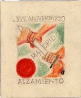 XXV Aniversario. Madrid. Alzamiento Bajo el lema de “XXV aniversario. Madrid. Alzamiento” se han representado en este dibujo enmarcado en la parte central y sobre un fondo verde cuatro manos que sostienen una espada por su filo de acero. En el lado derecho y en la esquina inferior destaca una circunferencia de color rojo.