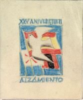 XXV Aniversario de alzamiento En el centro del dibujo enmarcado en un cuadrado pequeño se ha representado a una paloma blanca sobre un fondo azul en el que ondean tres banderas, entre ellas la española. Las demás banderas son de color blanco con un dibujo rojo y la otra es a rayas negras y rojas. Las palabras del lema se sitúan por encima y por debajo de la imagen.