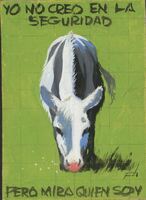 Yo no creo en la seguridad. Pero mira quien soy Entre los títulos con caracteres negros, en la parte superior e inferior, y sobre un fondo negro se encuentra la imagen de un caballo blanco pastando apaciblemente. A su lado izquierdo se puede ver la presencia del boceto de la firma del artista. La superficie del dibujo está ligeramente cuadriculada.