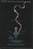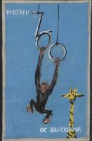 Visita el zoo de Barcelona En este dibujo enmarcado y sobre un fondo azul se han representado a dos animales: un mono que se balancea en unos aros que forman la palabra “zoo” y una jirafa amarilla con manchas negras. El título de la composición se encuentra repartido: a la derecha superior se puede leer en blanco “visita el”, en el centro “zoo” y a la izquierda inferior, también en blanco, “de Barcelona”.