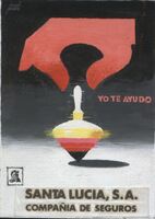 Yo te ayudo. Santa Lucia, S.A. Compañía de seguros Sobre un fondo mitad negro y mitad blanco surge, de la parte superior, una mano roja que hace girar una peonza blanca, amarilla, negra y roja. Al lado de estas figuras, por el lado izquierdo, se puede leer en letras rojas “yo te ayudo”. Inferiormente, se lee el título en letras negras sobre un fondo blanco.