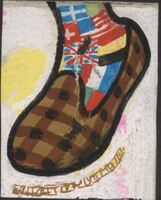 Zapatilla a cuadrados y media con banderas Se ha representado en este dibujo, cuyo lema es de difícil comprensión ya que está abocetado, una zapatilla a cuadrados marrones y negros y un pie, metido en la zapatilla, tapado con una media en la que destacan dibujos de varias banderas, entre las que destacan la inglesa, la alemana, la francesa, entre otras.
